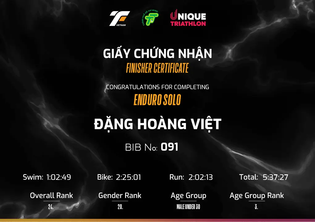 Story: I have an aspiration for finishing an IRONMAN race, a brutal one-day triathlon event with a course of 3.8km swim in the cold sea, 180km bike in the wind and heat and a marathon in tears. It is the ultimate test for my strength both physically and mentally, a test that less than 0.01% of the world has ever completed. It is hard, no wonder, yet for me, such challenge excites me. I have been training for a triathlon for a while now, I came to the Vietnam Trifactor Champition prepared. The distance that I raced was 2250m swim, 80km bike and 20 km run, half of an IRONMAN, but still a huge milestone for me to conquer as a part of my journey in becoming an IRONMAN
